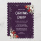 Modern purple Christmas party invitation featuring snowflakes and watercolor painting of poinsettia, holly and red berries.