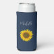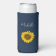 Elegant navy blue personalised seltzer can cooler with a yellow sunflower bloom image.. This lovely botanical item has white customisable script lettering with an elegant script. Perfect for enjoying your favourite cold beverage.