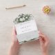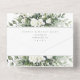 This all-in-one wedding invitation captures the essence of a botanical garden with its elegant floral header, featuring shades of porcelain white and a variety of greens, from mint to sage, enveloping timeless white roses. The invitation is designed for convenience with a tear-away RSVP postcard, seamlessly blending functionality with the delicate beauty of nature. A soft grey background provides a neutral canvas that accentuates the vibrant greens and soft whites of the floral design. Perfect for couples seeking a sophisticated and eco-friendly way to manage their wedding invitations and responses.