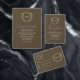 Wedding collection with earth tones of green and dark brown. A gold geometric monogram crest surrounded by botanical leaves.