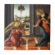 Botticelli Annunciation tile. Tempera painting on panel from 1490. Sandro Botticelli was one of the great religious painters of the early renaissance. Annunciation is one of his most moving paintings and features the angel Gabriel announcing the birth of Christ to the Virgin Mary. The angel has golden wings and wears a soft red cloak with gold sleeves and holds a long stem of lilies. A pretty gift for fans of Botticelli, Early Renaissance art, and Christian paintings.