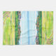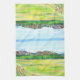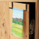 Bring the breathtaking beauty of the Colorado Front Range into your home with this Kitchen Towel. This original illustration captures the iconic Boulder Flatirons during the height of summer, featuring the lush green grasses of the Open Space fields and a rustic wooden fence in the foreground.