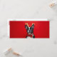 On the front: Black and white French Bulldog with a red bow tie and golden reindeer antlers, on a red background. The style is fun and quirky.