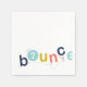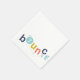 The bounce birthday party paper napkins feature an editable age are inside of the O and a bounce graphic with navy blue, aqua, yellow and orange letters. It coordinates with other items in our Bounce birthday invitation suite. Click edit to customise.