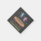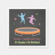 Party supplies paper napkins for a trampoline playground themed birthday party! The design is in a pastel colour palette which contrasts nicely with the texture greyish black background. Silhouettes of kids can be seen bouncing on the trampoline. Add the title in green text.