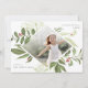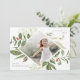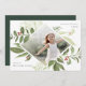 Elegant holiday photo card features a favourite photo surrounded by a geometric border of lush green botanical foliage and tiny red watercolor holly berries. "Let heaven and nature sing" appears at the upper right corner in grey lettering, with your family name at the lower left. Personalise the back with three additional photos and a personal message.