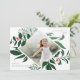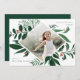 Elegant holiday photo card features a favourite photo surrounded by a geometric border of rich forest green botanical foliage and tiny red watercolor holly berries. "Let heaven and nature sing" appears at the upper right corner in grey lettering, with your family name at the lower left. Personalise the back with three additional photos and a personal message.