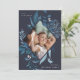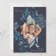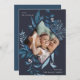 Elegant Hanukkah photo card for vertical photos features your photo surrounded by a geometric border of icy blue botanical foliage and tiny white watercolor berries. "Joyous Hanukkah" appears at the upper left corner in grey lettering, with your family name at the lower right.