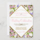 This elegant floral wedding invitation features a gold diamond shaped frame surrounded by a bounty of spring flowers including pink roses, purple or lavender hydrangea, and white orchids & calla lilies. Gorgeous invitation for a spring or summer wedding.