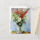 A postcard with the impressionist painting, Bouquet of Gladiolus, Lilies & Daisies (1878), by Claude Monet (1840-1926). A still life tableau featuring a vase on a table adorned with white lilies, red gladiolus and daisies.