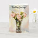 This charming card features my original artwork, consisting of my original photograph of pink roses in a crystal vase. I applied a watercolor painterly technique to give it an artistic flair. The front of the card states, "Birthday Greetings!" and the inside of the card states "Here's hoping your special day blooms with lots of bright fun and joy! Happy Birthday!". A great card for any flower lover.