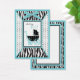 Boutique style zebra and dot print with turquoise accents and a baby carriage.