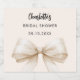 A cream, beige coloured background. Decorated with a large bow. Personalise and add the bride's name and a date. Black handwritten style script.