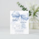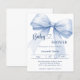 An elegant white background, decorated with a large blue bow. Personalize and add a name and party details.