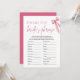 Engage your guests in a fun and interactive activity with our Finish the Bride's Phrase Bridal Shower Game. Guests will enjoy completing phrases or sentences that the bride would commonly say, sparking laughter and entertainment. With its charming pink bow design, this game adds a delightful touch to your bridal shower while creating memorable moments for the bride-to-be and her guests. Let the creativity flow as everyone tries to guess the bride's thoughts and words!