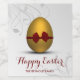 An elegant and modern Easter illustration featuring a golden Easter egg with a red bow with decorated floral swirl pattern illustration in professional classic white and grey colour shades.