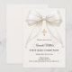 A soft ivory colored background, decorated with a large bow with pearls and a golden cross. Personalize and add a name and details details.