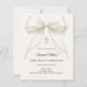 Celebrate your daughter's milestone with this elegant First Holy Communion invitation. This design features a stunning, oversized ivory silk bow adorned with delicate pearl strands and a central ornate gold cross. It is the perfect choice for a traditional Catholic ceremony or a sophisticated religious celebration for a young girl.