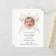 A white background, decorated with a large ivory colored bow with pearls and a golden cross. Personalize and add a photo, name and details details.