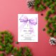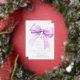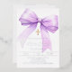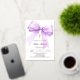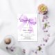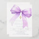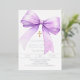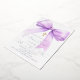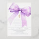 A white background, decorated with a lavender coloured large bow and a golden cross. Personalise and add a name and details details. Real silver foil text.