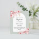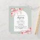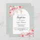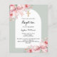 A white arch frame and sage green background. Decorated with pink flowers and pink bows. A golden cross. Personalise and add a name and details.