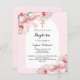 A white arch frame and light pint background. Decorated with pink flowers and pin bows. A golden cross. Personalise and add a name and details.