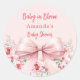 A blush pink background decorated with a large pink bow and roses. Tex: Baby in Bloom. Personalise and the mum to be's name.