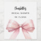 A white background. Decorated with a large pink bow. Personalise and add the bride's name and a date. Black handwritten style script.