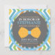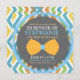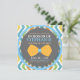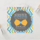 A custom baby boy invites featuring large bow tie design and diagonal stripes in blue and orange colours combination with charcoal