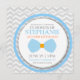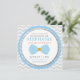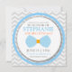 A custom baby boy invites featuring large bow tie design and diagonal stripes in blue and orange colours combination with charcoal