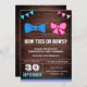 Amaze your guests with this cute gender reveal invite featuring a blue bow tie and a pink bow with modern typography against a barn wood background. Simply add your event details on this easy-to-use template to make it a one-of-a-kind invitation.