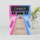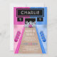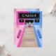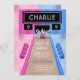 A bowling alley themed editable Birthday Invitation template. A blue and pink bowling alley is decorated with bowling balls, and a neon light screen that reads your child's name and age. A pink bowling ball is seen scattering the pins. Personalise by editing the digital or printed invite with your unique event details.