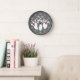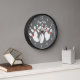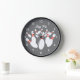 Bowling alley strike wall clock with custom text. Cool design with scattered bowling pins. Grey or custom colour dial. Fun clock for home, office, bar, cafe, restaurant, pub etc. Cool gift for king pin bowler.
