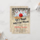 Combination birthday party invitations featuring a rustic wooden background, string twinkle lights, bowling ball, pins, pizza, and a modern birthday celebration template that is easy to personalise.