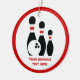 Bowling ball and pins black red custom round ormanent displaying a minimalist icon of three black bowling pins with red stripes, a ball and your text on white background with red border. This cool design is a template and it is completely customisable. Personalise it and change text with monogram, name or your message.