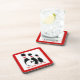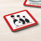 Bowling ball and pins custom beverage coaster that displays a minimalist icon of three black bowling pins with red stripes, a ball and your text on white background with red border.
