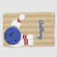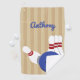 This accessory is perfect for your bowling bag. This towel is ready to be personalised with a name in blue script lettering, and features an illustraiton of a bowling ball and bowling pins set against a tan striped background.