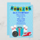 Start your celebration off right with a Bowling invitation for that special birthday boy. This is a cute, bowling invite set on light blue with diamond shapes background. It has the word "Bowling" spelt out hanging from a clothesline along the top. It has a all bowling attire at the bottom of the invite. There's bowling pins, a bowling ball, with a bag and red, white & blue bowling shoes. Check out other designs in this collection. ©babystar