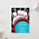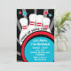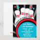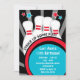 This fun bowling party invitation features bowling pins and a blue bowling ball.