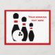 Bowling ball and black pins featuring a minimalist icon of three black bowling pins with red stripes, a ball and your text on white background with red border.