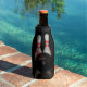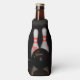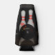 A bottle cooler featuring a photo of two bowling pins with a ball about to knock them down.