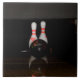 A ceramic tile featuring a photo of two bowling pins about to be knocked down by a bowling ball.