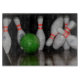 A cutting board featuring a photo of a bowling ball smashing into bowling pins.