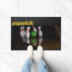 A doormat featuring a photo of a bowling ball knocking down bowling pins.