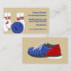 Promote your bowling coaching or instructing business or your bowling alley with these easy to customise business cards. These feature a realistic style illustration of a bowling ball and pins on the front and an illustration of a bowling shoe on the back. The front has spots for you to add your name and custom contact details in bowl blue lettering.