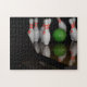 A jigsaw puzzle made using an image of a bowling ball smashing into the pins.