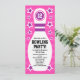 Fun and colourful bowling party invitation for children featuring a white bowling pin with customisable birthday age and invite text surrounded by white and purple stars on a hot pink background. For custom requests please use the store contact link above.