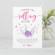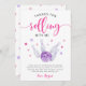 Cute bowling theme girl's birthday party thank you card featuring watercolor illustration of a bowling ball hitting some pins with pink and purple stars around. The text says "thanks for rolling with me."