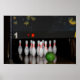 A poster featuring a photo of a rack of bowling pins with a green bowling ball about to hit them.