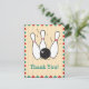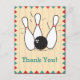 This fun design features a bowling ball striking a few pins. There is a fun bunting border in red and teal, as well as a wood background. Personalise the front and back with your own text. These postcards are great for saying thank you after a bowling party. They are especially fun for a kids birthday party.
